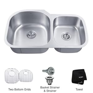 Add an elegant touch to your kitchen with a unique and versatile undermount sink from Kraus Stainless steel sink is a great centerpiece for any kitchen remodeling projectKraus kitchen sink boasts 16-gauge premium grade T-304 stainless steel construction with an 18/10 chromium/nickel compositionScratch-resistant commercial-grade premium satin finishPadded and Stone Guard undercoated insulation over a rubber pad reduces noise while sink is in use Rear-set 3.5-inch drain opening gives you more storage space 3.5-inch opening is compatible with most garbage disposals available in the market. Please note, Garbage Disposal Flange & Stopper Kit must be purchased separately Kraus Stainless Steel Kitchen sink comes with: Set of stainless steel bottom grids with protective feet and bumpersStainless steel basket strainerStainless steel strainerDish towelMounting and installation brackets, cutout template are included35.13-Inch L x 20.75-Inch W x 9-Inch H (overall sizes)17.75-Inch L x 18.5-Inch W x 9-Inch H (bowl sizes)13.75-Inch L x 15.75-Inch W x 7.5-Inch H (bowl sizes)Fits 36-Inch cabinetCertified and Listed by UPC, cUPC, CSA, IAPMO, ANSI and SCC Manufactured by KrausLimited Lifetime Warranty